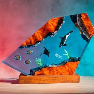 Personalized Ocean Epoxy Lamp with Sea Creatures – Handmade Resin and Natural Wood Decor Light for Gift, Room, or Desk Display